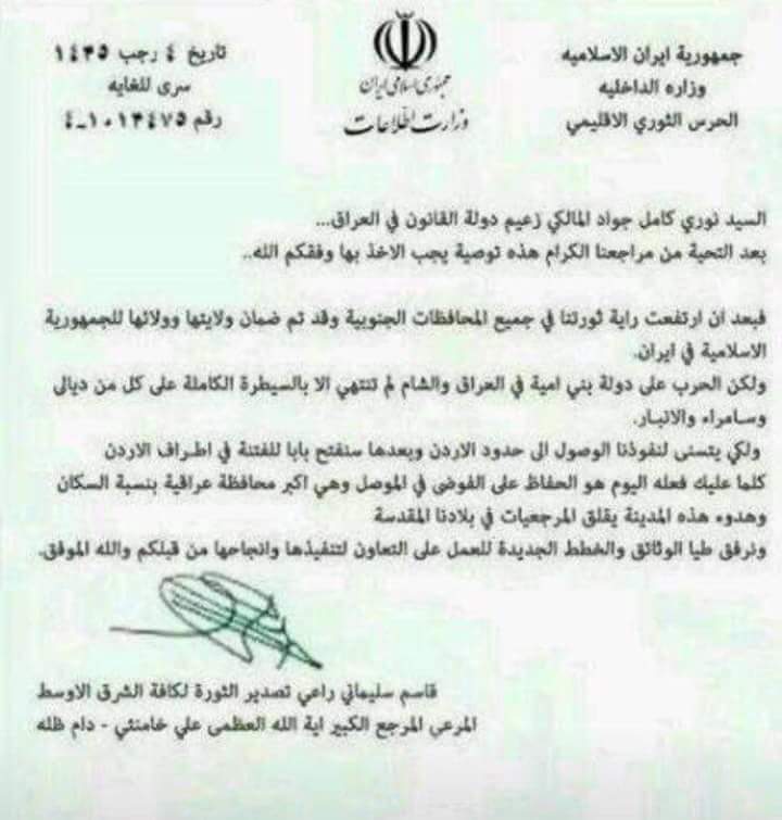 لقد كشفت وثيقة مرسلة وموقعة من قائد فيلق القدس “قاسم سليماني” إلى نوري كامل جواد المالكي زعيم دولة القانون في العراق حسب ما جاء في الوثيقة، المساعي الإيرانية في محاولة تخريب الأمن في الأردن، ونقل الفتنة والفوضى إلى الأردن، وتظهر الوثيقة أن سليماني طالب نوري المالكي الحفاظ على الفوضى في الموصل أكبر المحافظات بنسبة السكان، وذلك لأن هدوء هذه المدينة يقلق المرجعيات في إيران حسب كلام سليماني، وقد تم إرسال هذه الرسالة في تاريخ 4 رجب 1435هجري الموافق 3 مايو 2014م.
