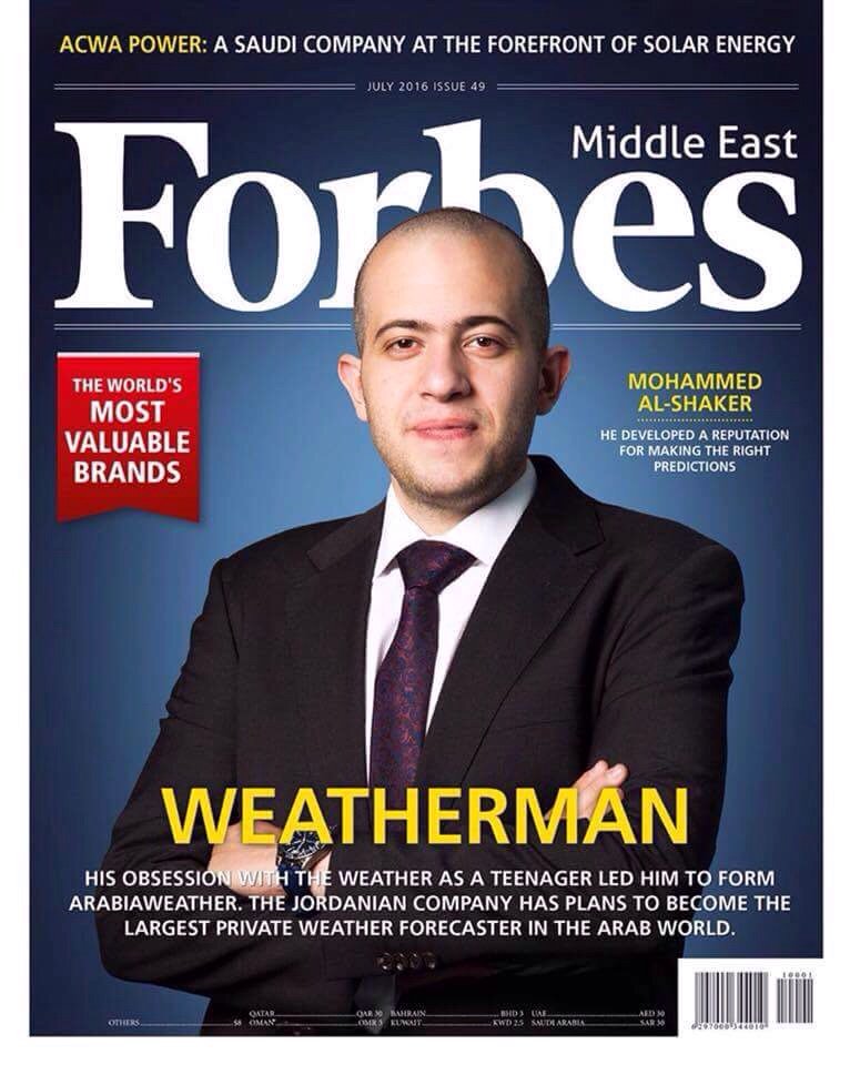بعد مرور 10 أعوام على إطلاقه أول موقع لمراقبة الأحوال الجوية والطقس في الأردن والوطن العربي تصدر الراصد الجوي الأردني محمد الشاكر الغلاف الرئيسي لمجلة فوربس العالمية في نسختها للشرق الأوسط كأحد الأشخاص المؤثرين في العالم.