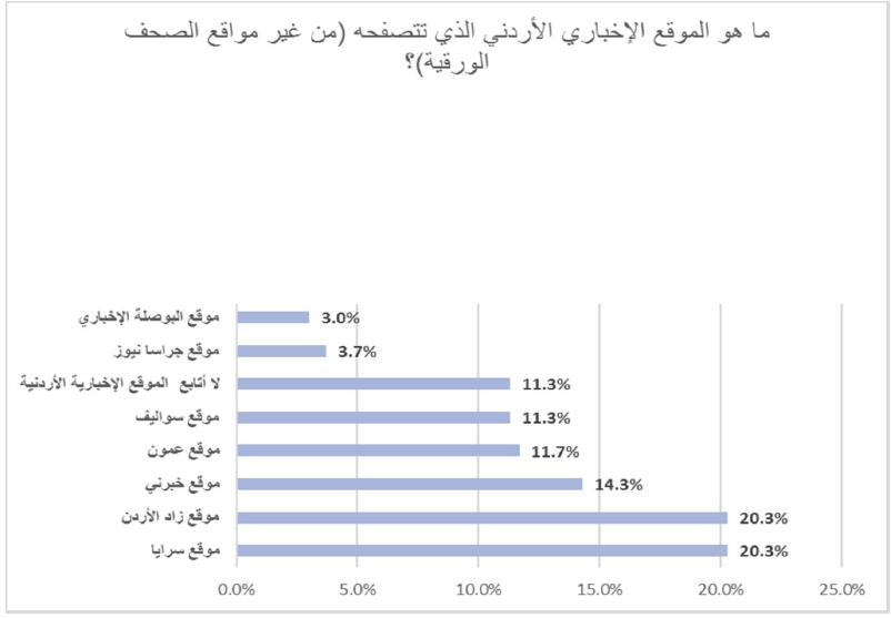 في المقابل حازت المواقع الالكترونية بنتائج مرتفعة من حيث الاهتمام والمتابعة اذ حاز كل من موقعي سرايا و زاد الاردن على المرتبة الأولى بنسبة (20.3%) تبعهما موقع خبرني بنسبة (14.3%) و موقع عمون بنسبة (11.7%).