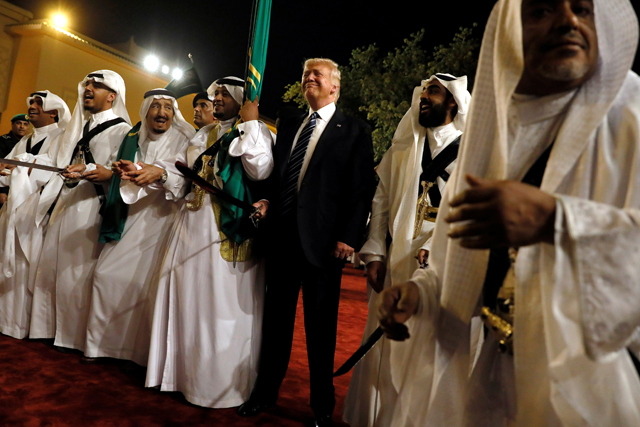 شارك الرئيس الأميركي، دونالد ترامب، الملك سلمان بن عبد العزيز، عاهل المملكة العربية السعودية، الرقصة التقليدية السعودية "العرضة" خلال جولة قام بها الرئيسيين لمركز الملك عبد العزيز التاريخي السبت.