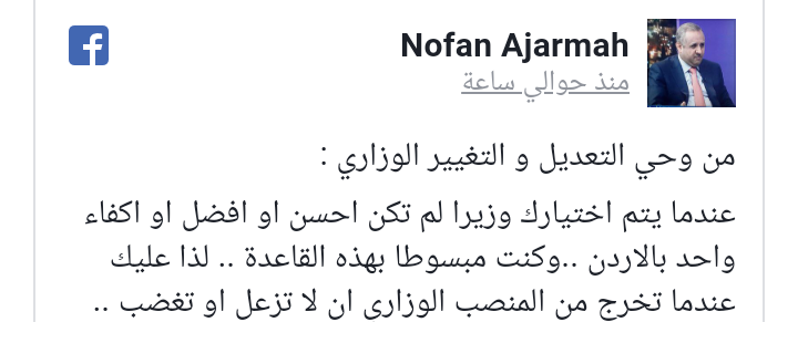 وقال العجارمة في منشور له على فيسبوك: "عندما يتم اختيارك وزيرا لم تكن احسن او افضل او اكفاء واحد بالاردن ..وكنت مبسوطا بهذه القاعدة".