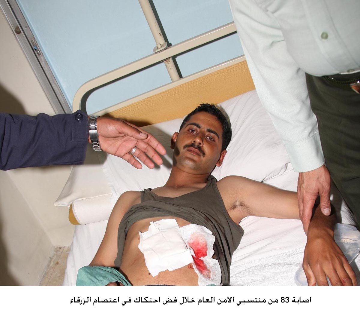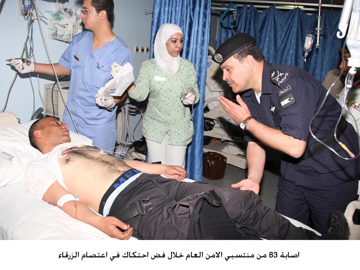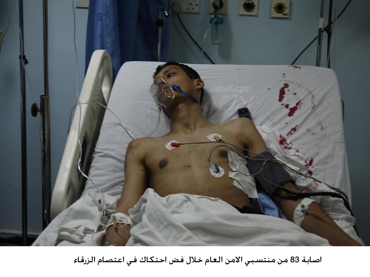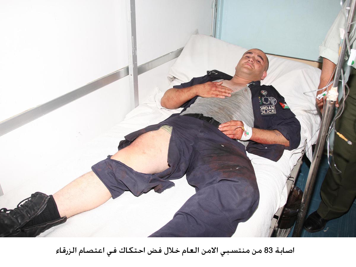 أصيب حوالي 83 شخصا من منتسبي جهاز الامن العام خلال فض اشتباك بين انصار التيار السلفي ورجال الامن والدرك في الزرقاء يوم الجمعة.