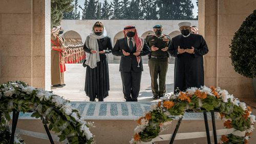 زار الملك عبدالله الثاني و الملكة رانيا العبدالله و الأمير الحسين بن عبدالله الثاني ولي العهد، ضريح المغفور له، بإذن الله، الملك الحسين بن طلال، طيب الله ثراه، بمناسبة الذكرى الثانية والعشرين لرحيله.