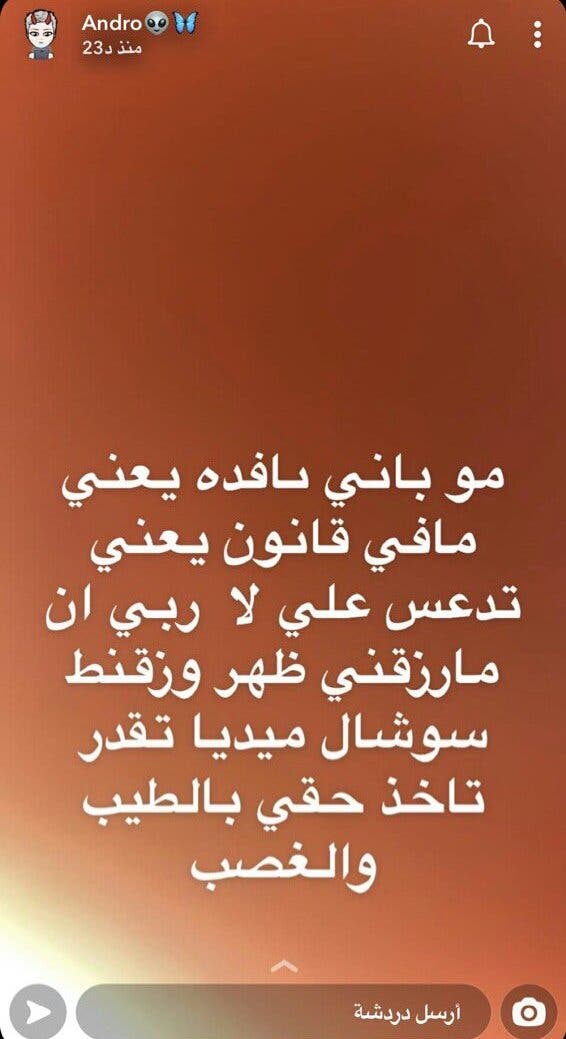 وفي الوقت الذي لم يتسنَ لموقع البوابة التحقق من صحة النبأ، إلا إن عددًا من المغردين زعموا بأن آخر ما كتبته على "سناب شات" توعدت فيه الجاني ووجهت له الحديث قائلة: "مو لأني نافدة يعني ما في قانون، يعني تدعس علي، ربي ما رزقني ظهر لكن السوشال ميديا تقدر تاخذ حقي بالطيب والغصب".