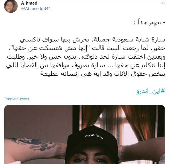 فيما كتب أحد المغردين ويدعى أحم بأن سارة تعرضت للتحرش من قبل سائق تاكسي، وقال في تغريدة كتبه عبر ذات الوسم: "سارة شابة سعودية جميلة، تحرش بيها سواق تاكسي حقير، لما رجعت البيت قالت إنها مش هتسكت عن حقها، وبعدين اختفت سارة لحد دلوقتي بدون حس ولا خبر، وطلبت إننا نتكلم عن حقها ... سارة معروف مواقفها من القضايا اللي بتخص حقوق الإناث وقد إيه هي إنسانة عظيمة".