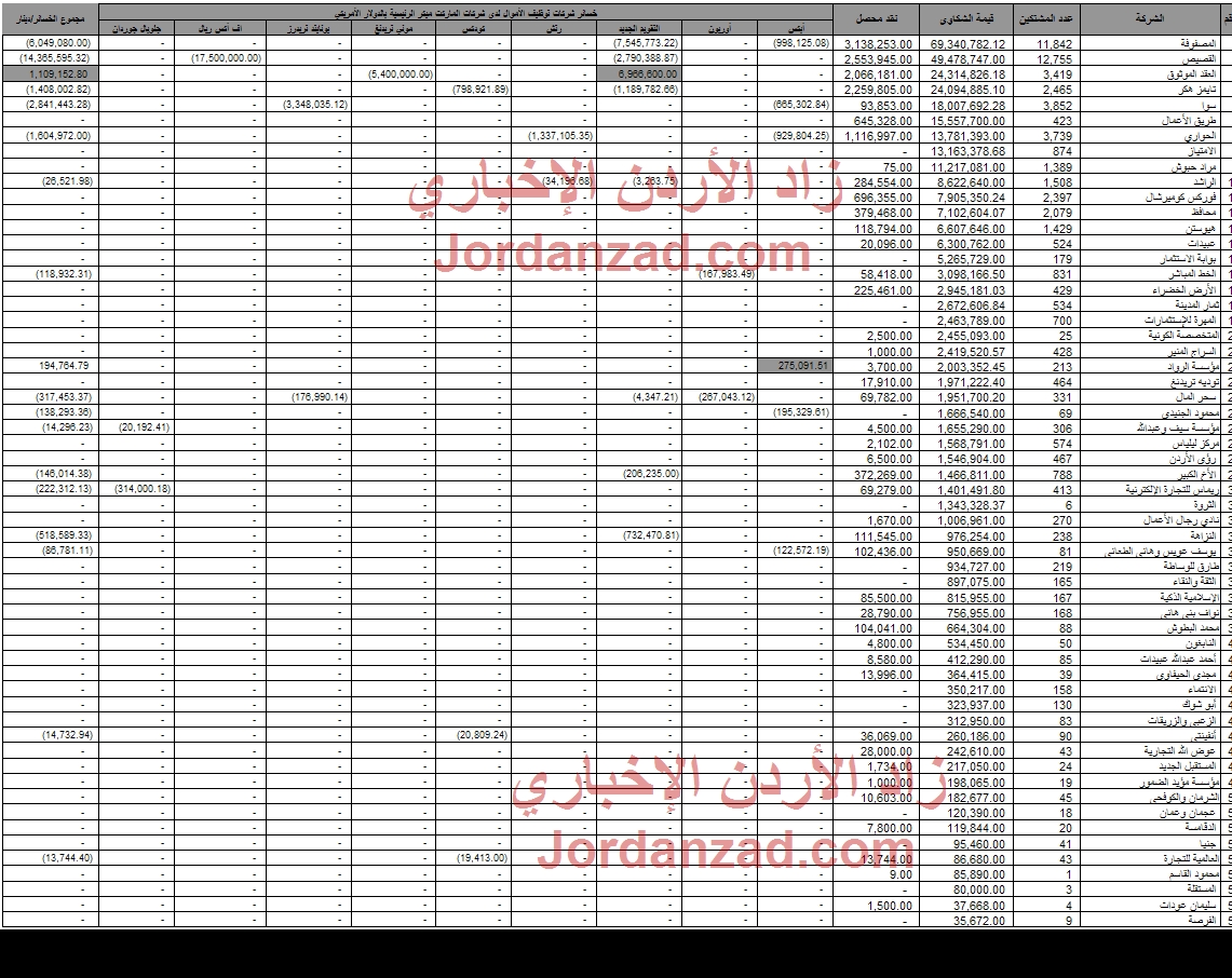 وحتى يكون المواطن الأردني المتضرر من القضية على بينه من أمره، ففيما يلي جدول يتضمن حجم الشكاوى المقدمة على شركات توظيف الأموال، والتحصيلات النقدية في كل شركة، وخسائر تلك الشركات في تعاملاتها مع شركات الماركت ميكر للمضاربة في الأسواق العالمية وإجمالي تلك الخسائر، ونكتفي بالإشارة إلى أن المواطن الأردني على درجة عالية من الثقافة ليقوم بالمقارنة بين حجم الأموال المشتكى بها على كل شركة، بمقابل التحصيلات النقدية في تلك الشركات، ومجموع الخسائر التي لحقت بكل شركة جراء تعاملاتها في البورصة العالمية مع شركات الماركت ميكر التي تم رصدها فقط ومن خلال السيرفرات الخاصة بها، علماً بأن هذا الكشف يتضمن الجسم الرئيسي للقضايا التي لا زالت منظروة أمام القضاء الأردني.