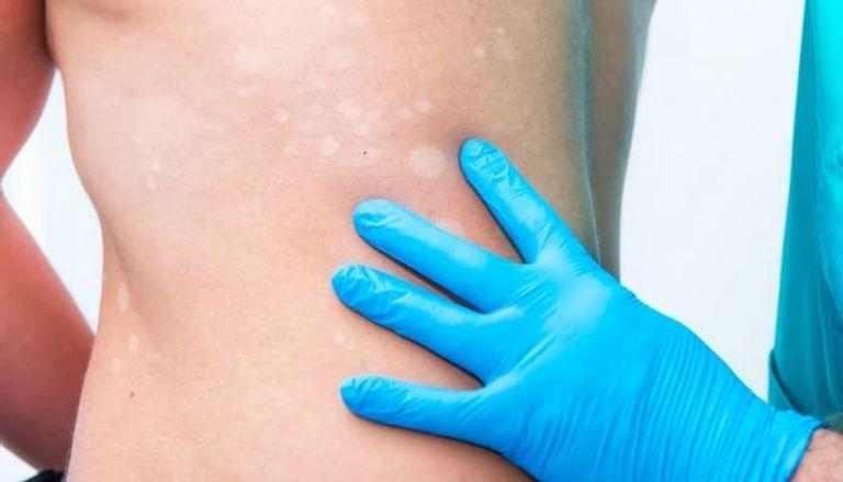 ظهور بقع جلدية باللون البني الفاتح أو الداكن أو اللون الأبيض أو الوردي في منطقة الصدر أو الظهر أو الذراعين أو الرقبة.