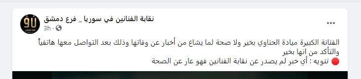 ونوهت النقابة إلى أن أي خبر لم يصدر عن نقابة الفنانين فهو عار من الصحة.