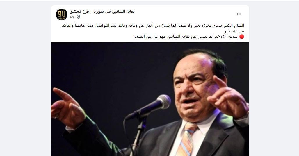 ردت نقابة الفنانين السوريين، اليوم الأحد، على شائعات وفاة الفنانين صباح فخري وميادة الحناوي.