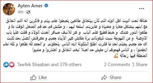 وأكملت آيتن عامر: (والحمد لله طلعوا وكله تمام اطمنوا، والناس فهموهم أن مفيش حد أصلا تبعي اتخانق واعتذروا ومشيوا المنطقة فيها رجالة).