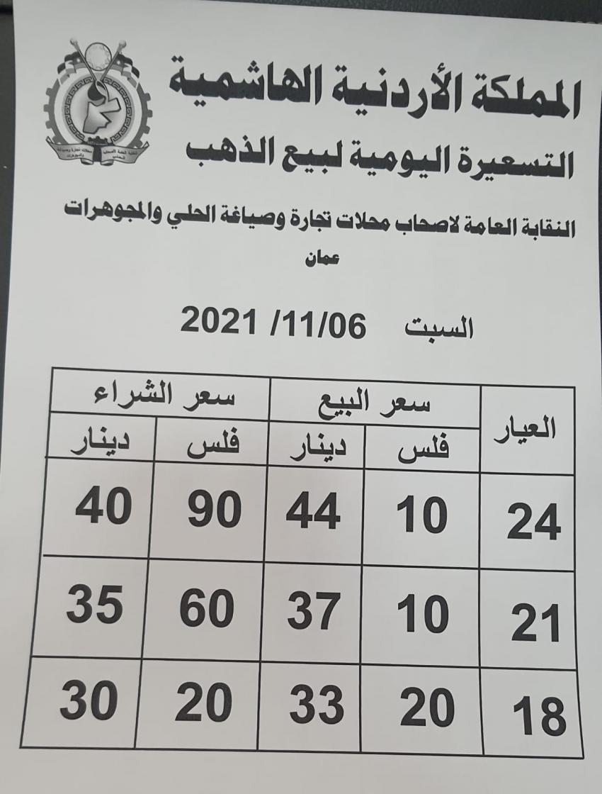بلغ سعر الذهب عيار 24 قيراط في الأردن السبت، 44.10 دينار، فيما بلغ سعر الذهب عيار 21 الأكثر رغبة بين المواطنين 37.10 دينار.