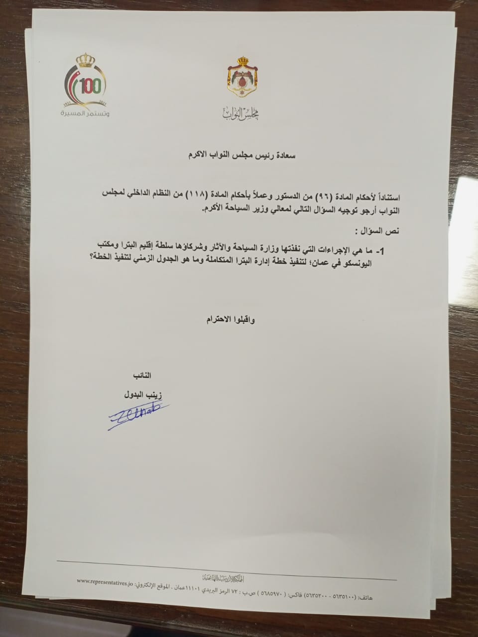 وجهت النائب زينب البدول سؤالا لوزارة السياحة تستعلم من خلاله عن مستويات تنفيذ خطة ادارة البترا المتكاملة الصادرة عن مكتب اليونسكو في عمان والتي تم اعدادها بالتعاون مع شركائها.