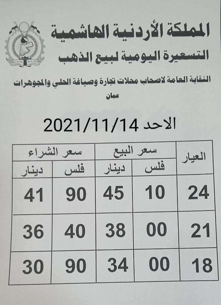 وبحسب التسعيرة فقد وصل سعر بيع غرام الذهب عيار 21 قيراط الأكثر طلبا في السوق المحلية إلى 38 دينارا، ولجهة الشراء 36.4 دينارا.