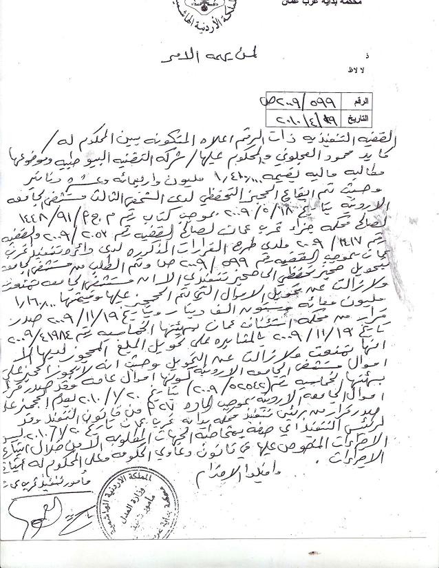 العجلوني، توجه إلى القضاء لأنصافه، القضاء إصدار قراران قطعيان من أعلى هيئة قضائية(الخماسية) يثبتان حقه في القضيتين رقم(599 /2009 /ص)و( 1080 / 2009/ ك).