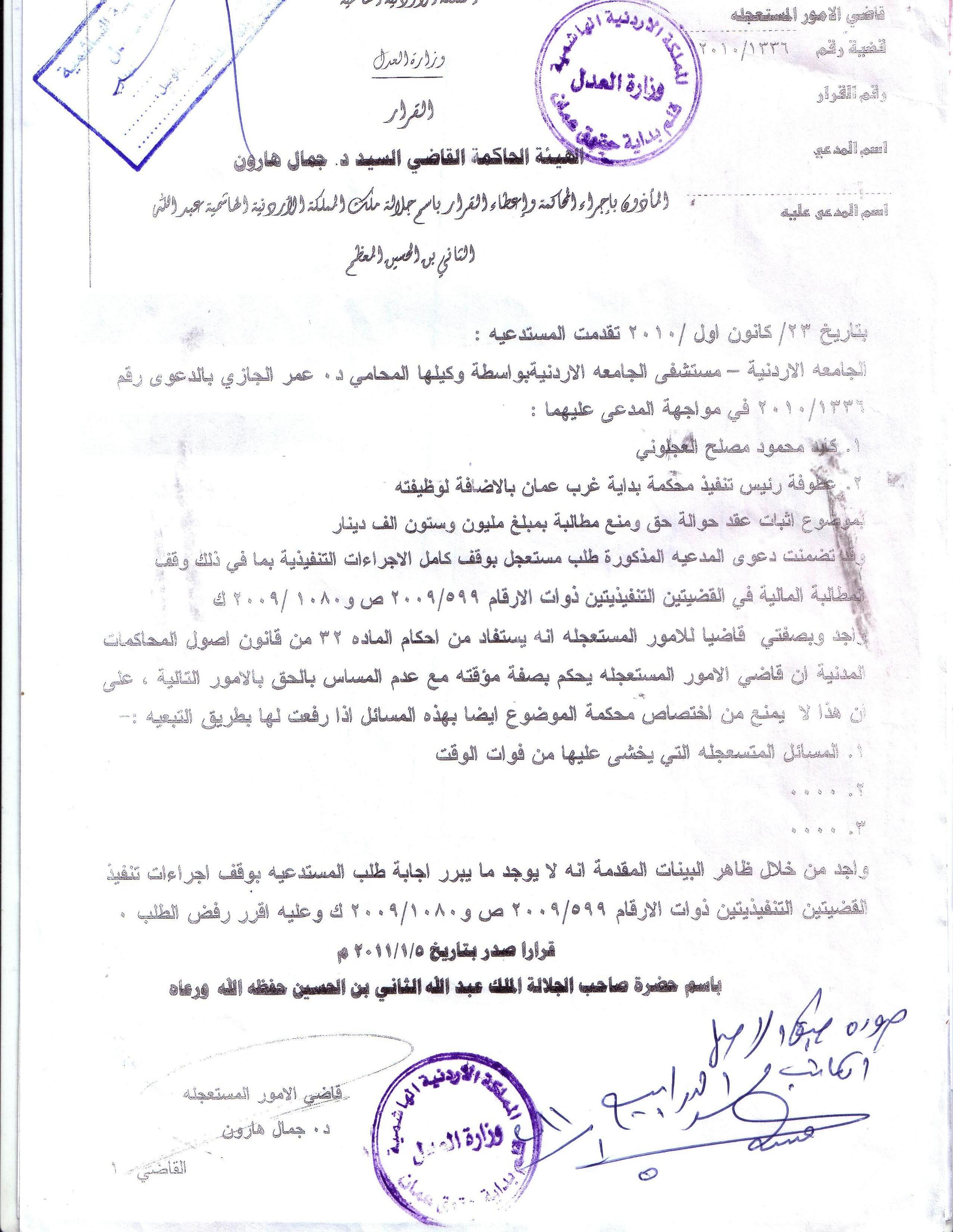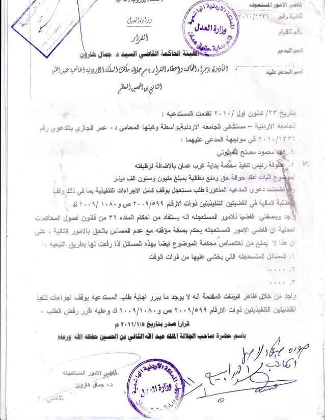 في تاريخ 5/1/2011 من طرفة رفض قاضي الأمور المستعجلة القضية طلب الجامعة الأردنية، كون القرارات نهائية صادرة عن الهيئة القضائية الخماسية، وقامت بإقرار الطلب السابق.