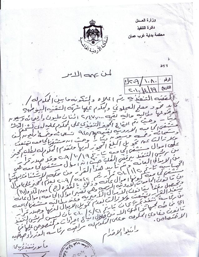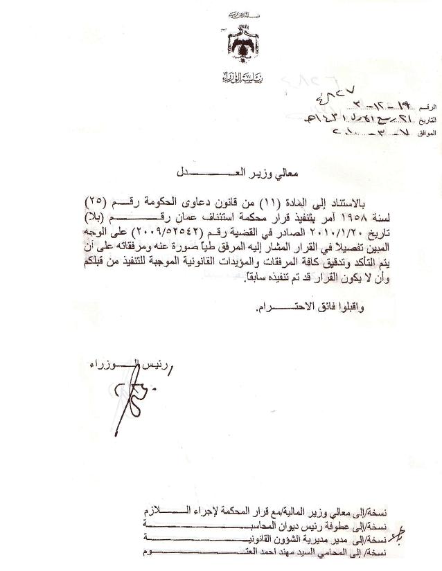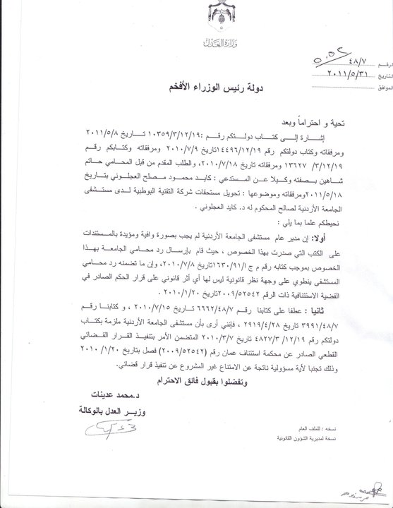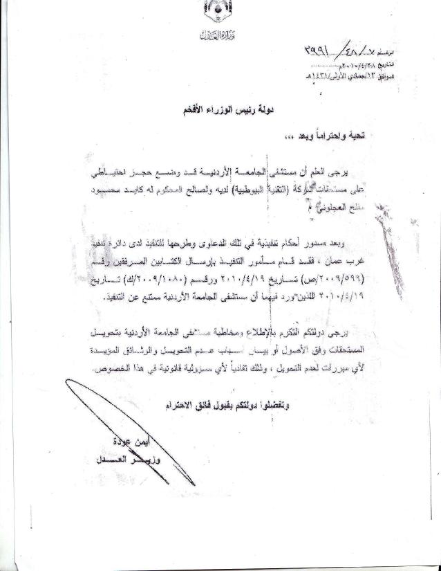 في 31/5/2011 خاطب وزير العدل بالوكالة الدكتور محمد عدينات، دولة رئيس الوزراء معروف البخيت، بكتاب ملزم ينص بالحرف الواحد على ضرورة تنفيذ الحكم التنفيذي القطعي الصادر عن محكمة استئناف عمان 52542/2009، بتاريخ 20/1/2010 بحق مستشفى الجامعة الأردنية.