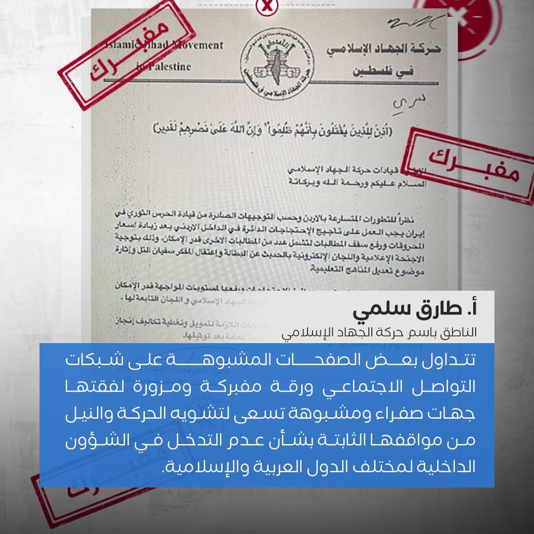 بدوره، قال الناطق باسم حركة الجهاد الإسلامي طارق سلمي، إنّ بعض الصفحات المشبوهة على شبكات التواصل الاجتماعي تتداول ورقة مفبركة ومزورة لفقتها جهات صفراء ومشبوهة تسعى لتشويه الحركة والنيل من مواقفها الثابتة بشأن عدم التدخل في الشؤون الداخلية لمختلف الدول العربية والإسلامية"، داعيًا وسائل الإعلام إلى الحذر التام وعدم تداول هذه الورقة.
