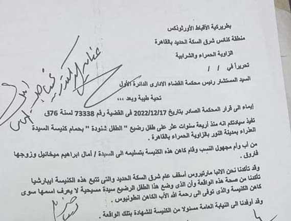 وجاء في الوثيقة أنه ومنذ 4 أعوام عُثر على طفل رضيع "الطفل شنودة" بحمام كنيسة السيدة العذراء بمدينة النور بالزاوية الحمراء بالقاهرة، من أب وأم، مجهول النسب، وسلمه كاهن الكنيسة إلى آمال إبراهيم ميخائيل وزوجها فاروق.