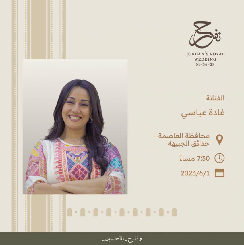 كما سيكون الحفل الفني للفنانة غادة عباسي في حدائق الجبيهة عند الساعة السابعة والنصف، فيما سيكون الفنان حمدي المناصير في حدائق الجبيهة أيضا عند الساعة التاسعة مساءً.