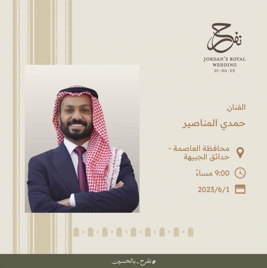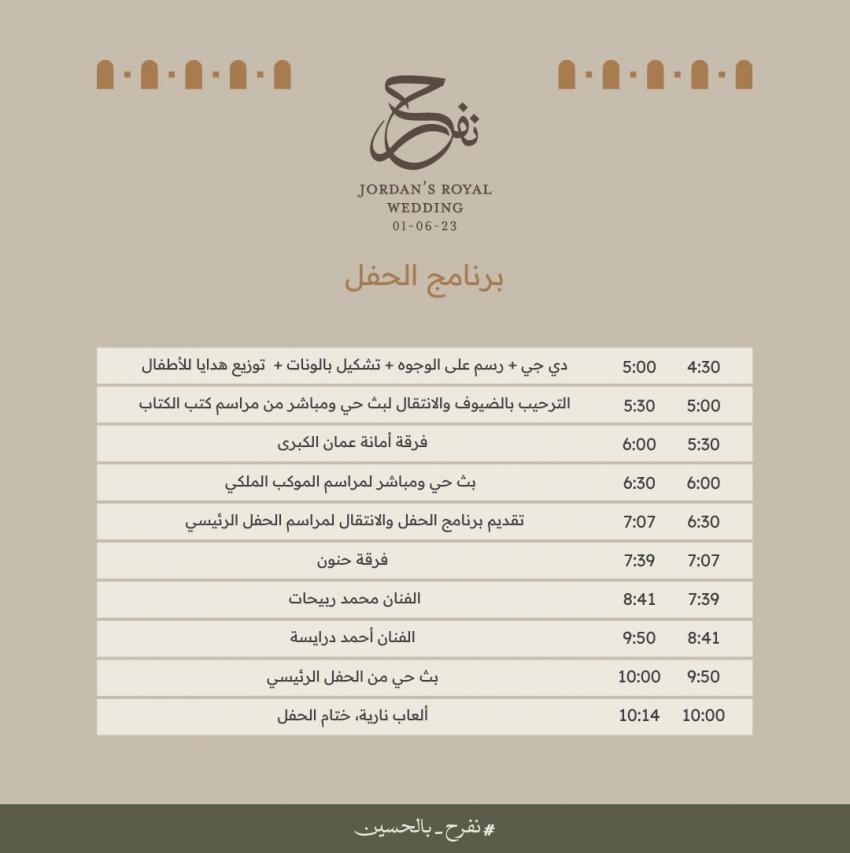 وسيكون هنالك بث حي ومباشر من مراسم كتب الكتاب لولي العهد سمو الأمير الحسين بن عبد الله الثاني على الآنسة رجوة السيف، عند الساعة الخامسة.