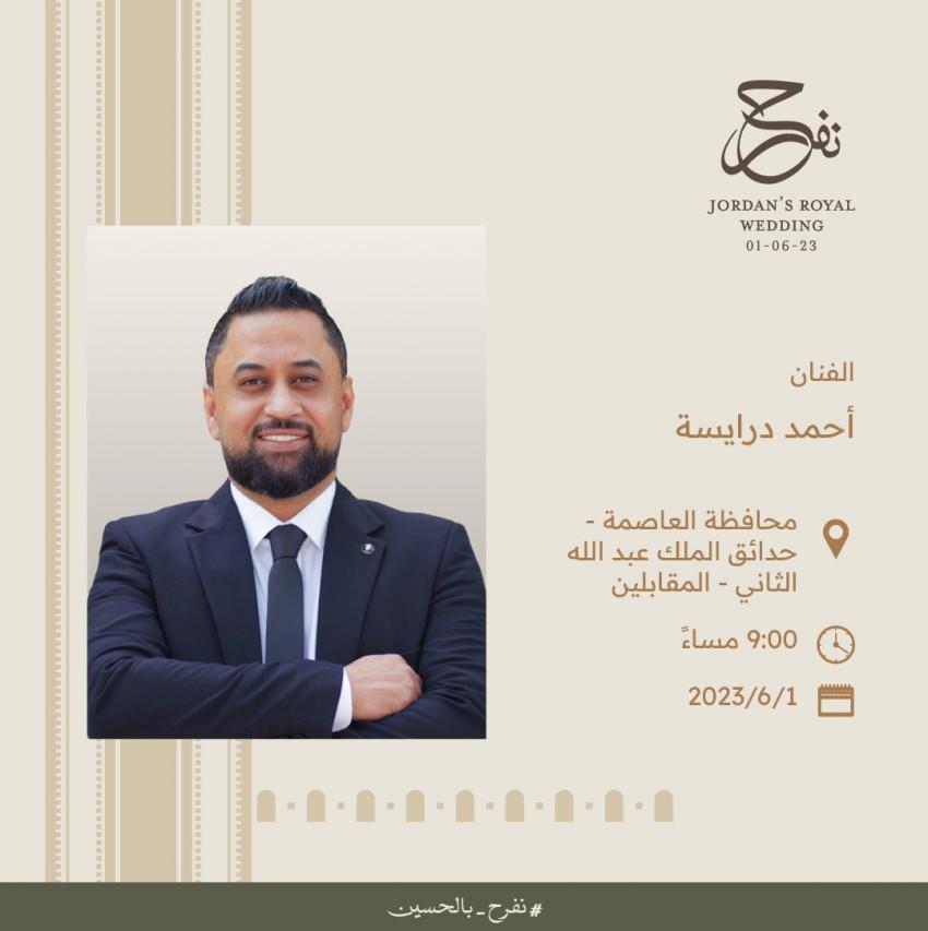 اما الحفل الفني للفنان أحمد درايسة سيكون حفله في حدائق الملك عبد الله الثاني في المقابلين عند الساعة التاسعة مساءً، وسيكون حفل الفنان محمد ربيحات عند السابعة والنصف في ذات الموقع.