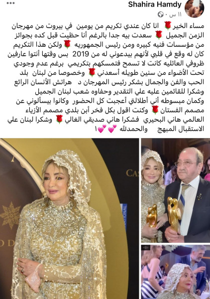 وشاركت شهيرة جمهورها ومتابعيها عبر حسابها على موقع التواصل الاجتماعي (فيسبوك) مجموعة صور من الحفل وعلقت عليهم"مساء الخير، أنا كان عندي تكريم من يومين في بيروت من مهرجان الزمن الجميل. سعدت بيه جدا بالرغم أنا حظيت قبل كده بجوائز من مؤسسات فنية كبيرة ومن رئيس الجمهورية ولكن هذا التكريم كان له وقع في قلبي لأنهم بيدعوني له من 2019 بس وقتها أنتوا عارفين ظروفي العائلية كانت لا تسمح فتمسكهم بتكريمي برغم عدم وجودي تحت الأضواء من سنين طويله أسعدنى وخصوصا من لبنان بلد الحب والفن والجمال"