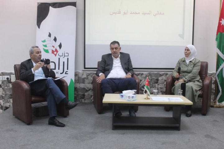 وأكد الأمين العام نضال البطاينة في كلمة القاها في بداية اللقاء ان حزب إرادة حزب وطني نبع من رحم الشعب يؤمن بالثوابت الوطنية ووصل كل بقعة من بقاع الأردن ونفذ حتى الان 563 لقاء في مناطق المملكة،