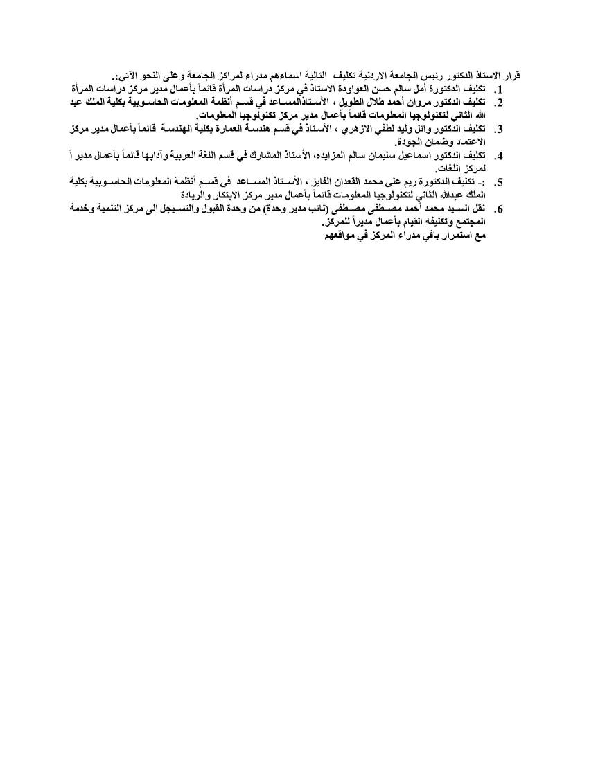 2. تكليف الدكتور مروان أحمد طلال الطويل ، الأستاذالمساعد في قسم أنظمة المعلومات الحاسوبية بكلية الملك عبد الله الثاني لتكنولوجيا المعلومات قائماً بأعمال مدير مركز تكنولوجيا المعلومات.
