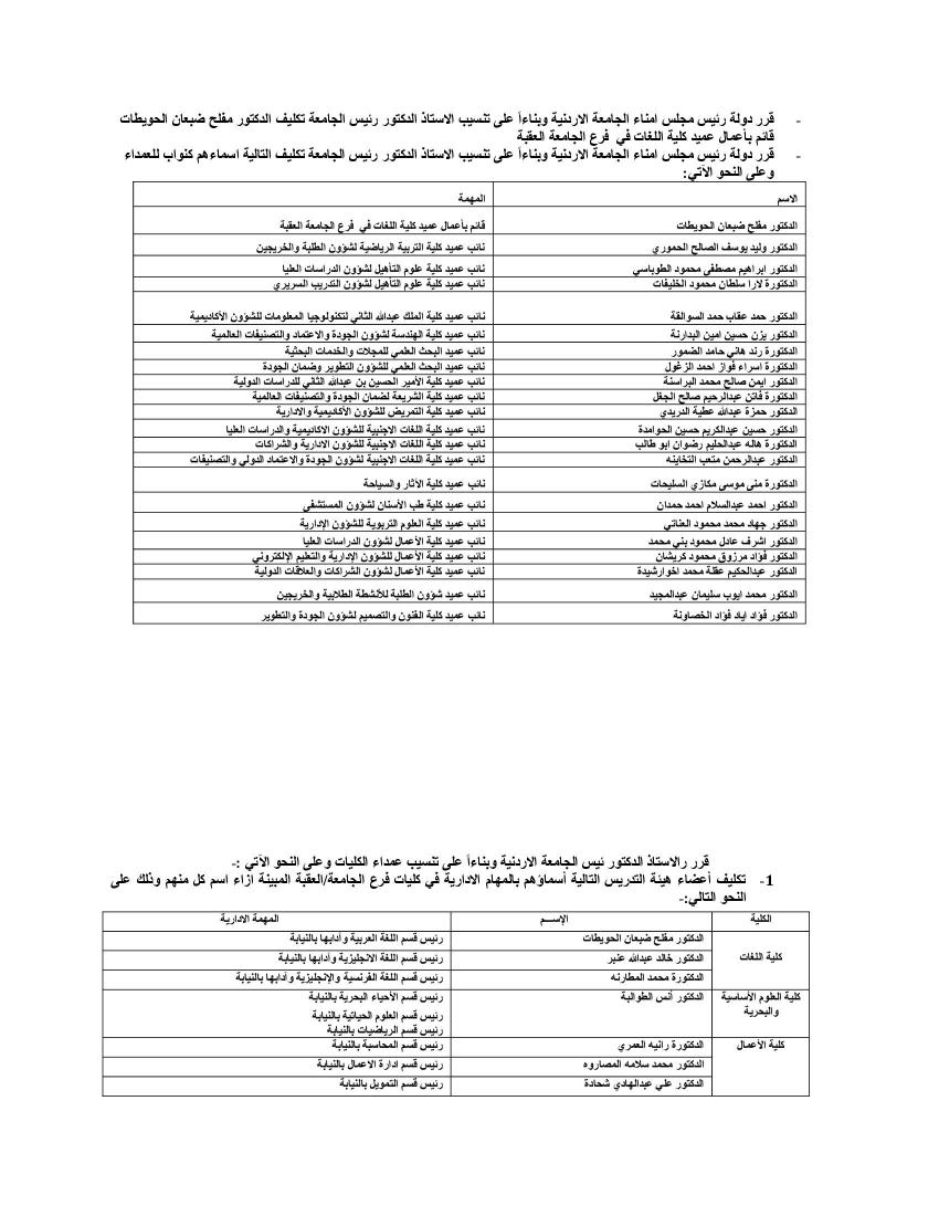 1- تكليف أعضاء هيئة التدريس التالية أسماؤهم بالمهام الادارية في كليات فرع الجامعة/العقبة المبينة ازاء اسم كل منهم وذلك على النحو الآتي: