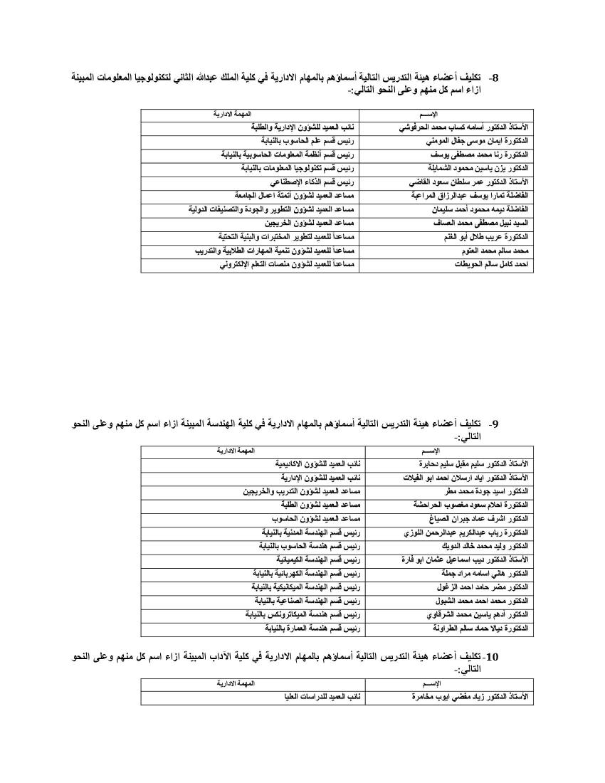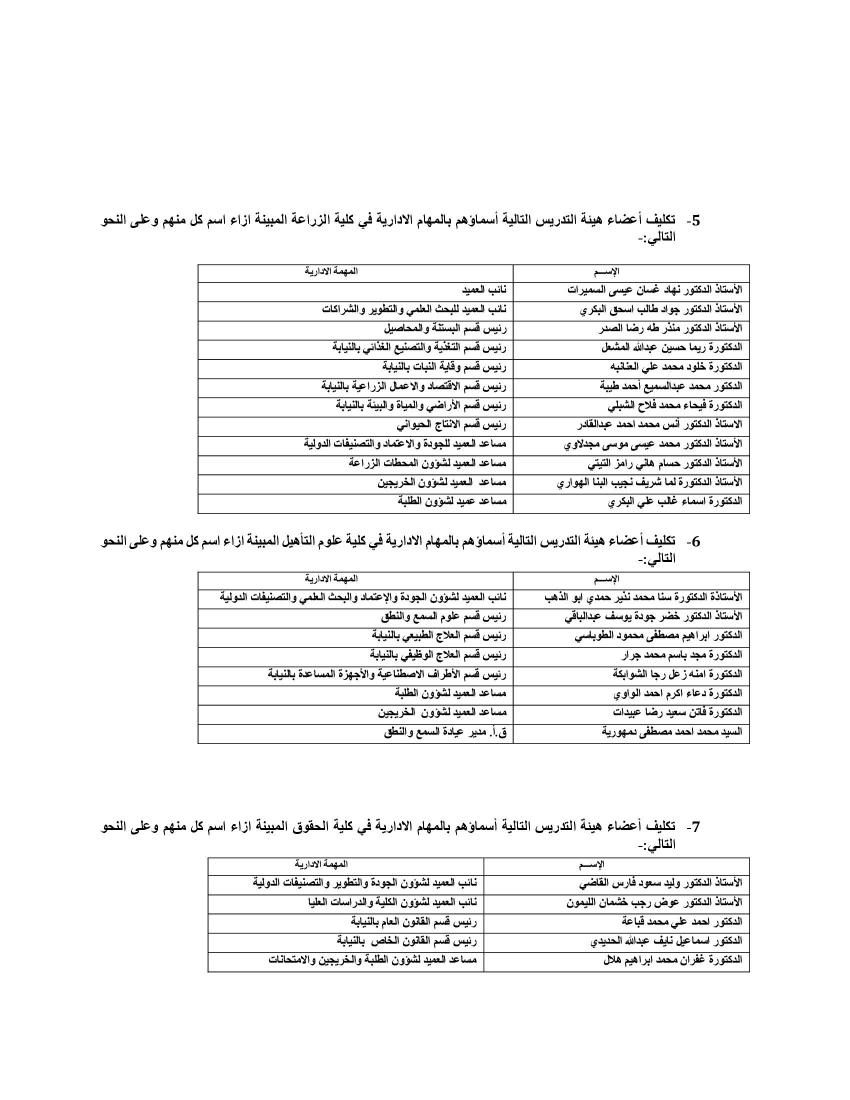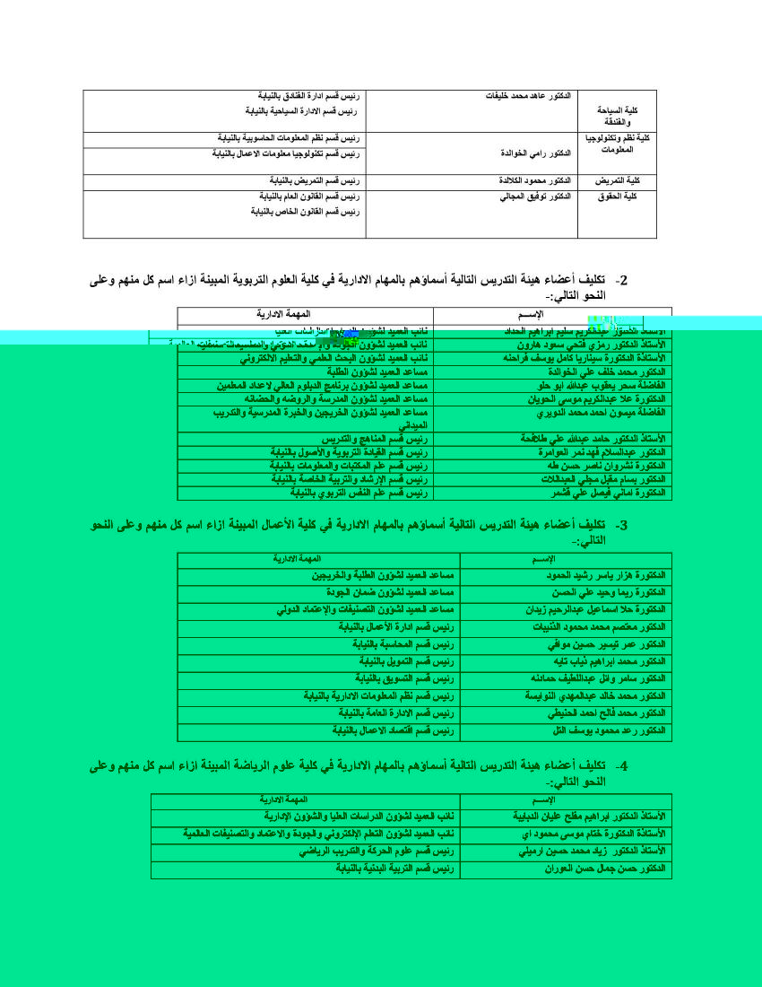 2- تكليف أعضاء هيئة التدريس التالية أسماؤهم بالمهام الإدارية في كلية العلوم التربوية المبينة ازاء اسم كل منهم وعلى النحو الآتي:-