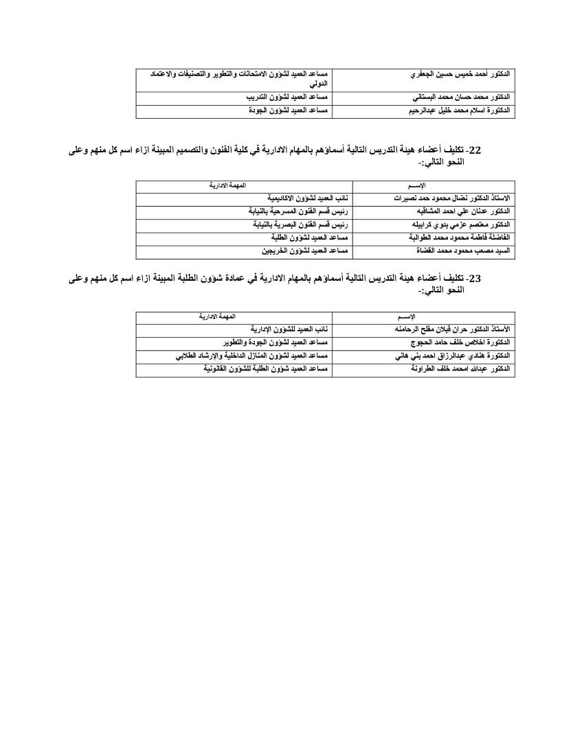 22- تكليف أعضاء هيئة التدريس التالية أسماؤهم بالمهام الادارية في كلية الفنون والتصميم المبينة ازاء اسم كل منهم وعلى النحو الآتي