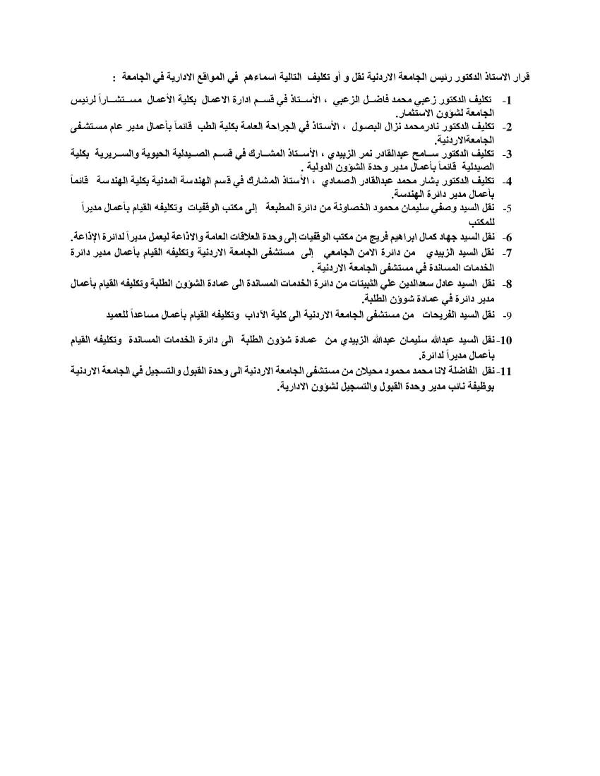 1- تكليف الدكتور زعبي محمد فاضل الزعبي ، الأستاذ في قسم ادارة الاعمال بكلية الأعمال مستشاراً لرئيس الجامعة لشؤون الاستثمار.