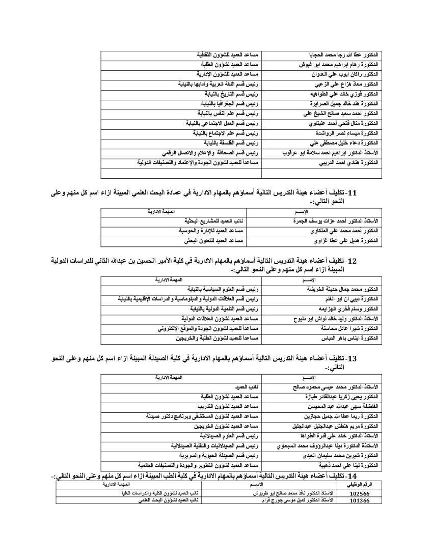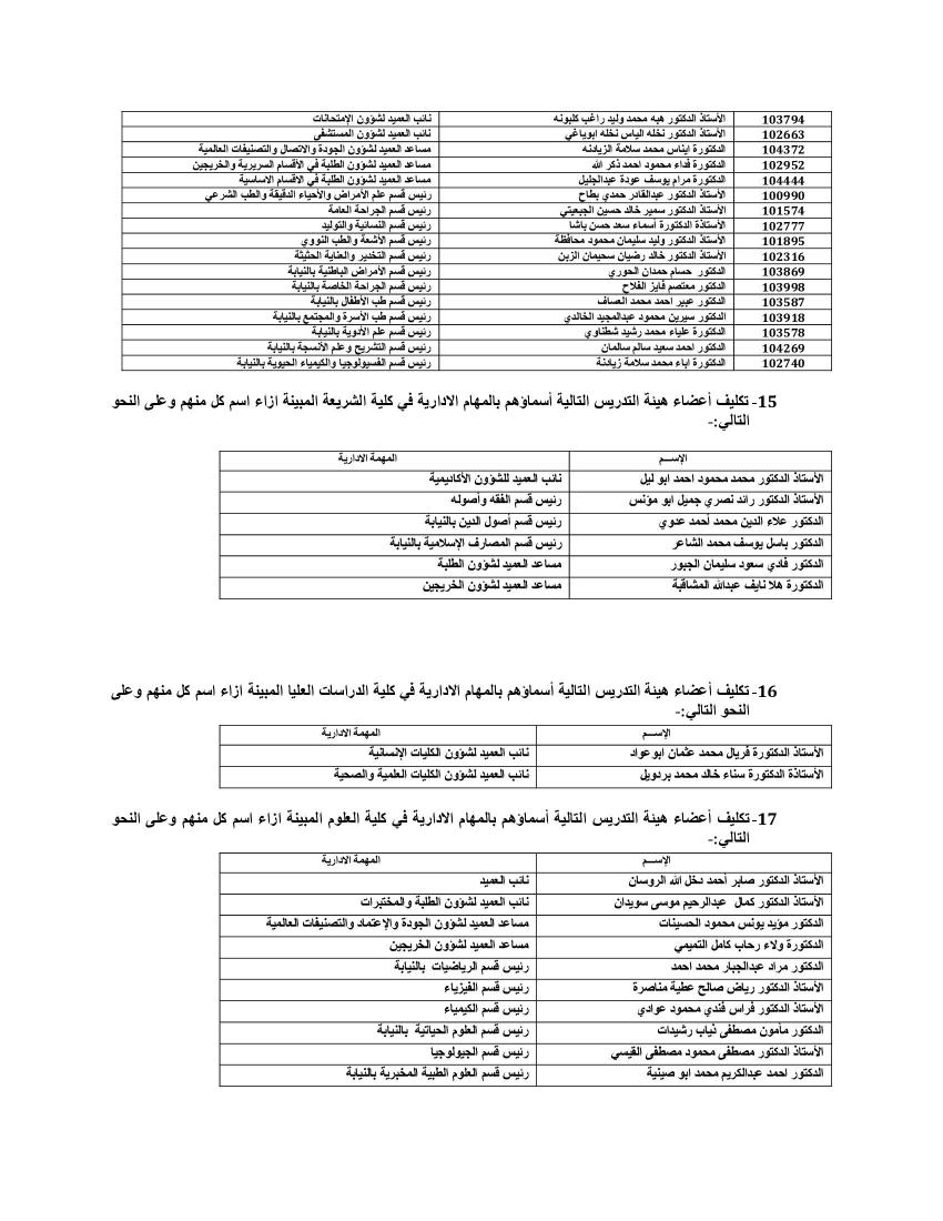 15- تكليف أعضاء هيئة التدريس التالية أسماؤهم بالمهام الادارية في كلية الشريعة المبينة ازاء اسم كل منهم وعلى النحو الآتي
