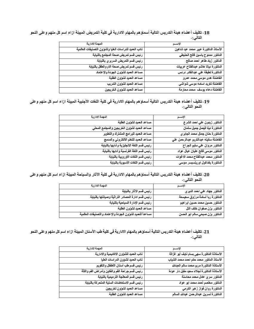 21- تكليف أعضاء هيئة التدريس التالية أسماؤهم بالمهام الادارية في كلية طب الأسنان المبينة ازاء اسم كل منهم وعلى النحو الآتي