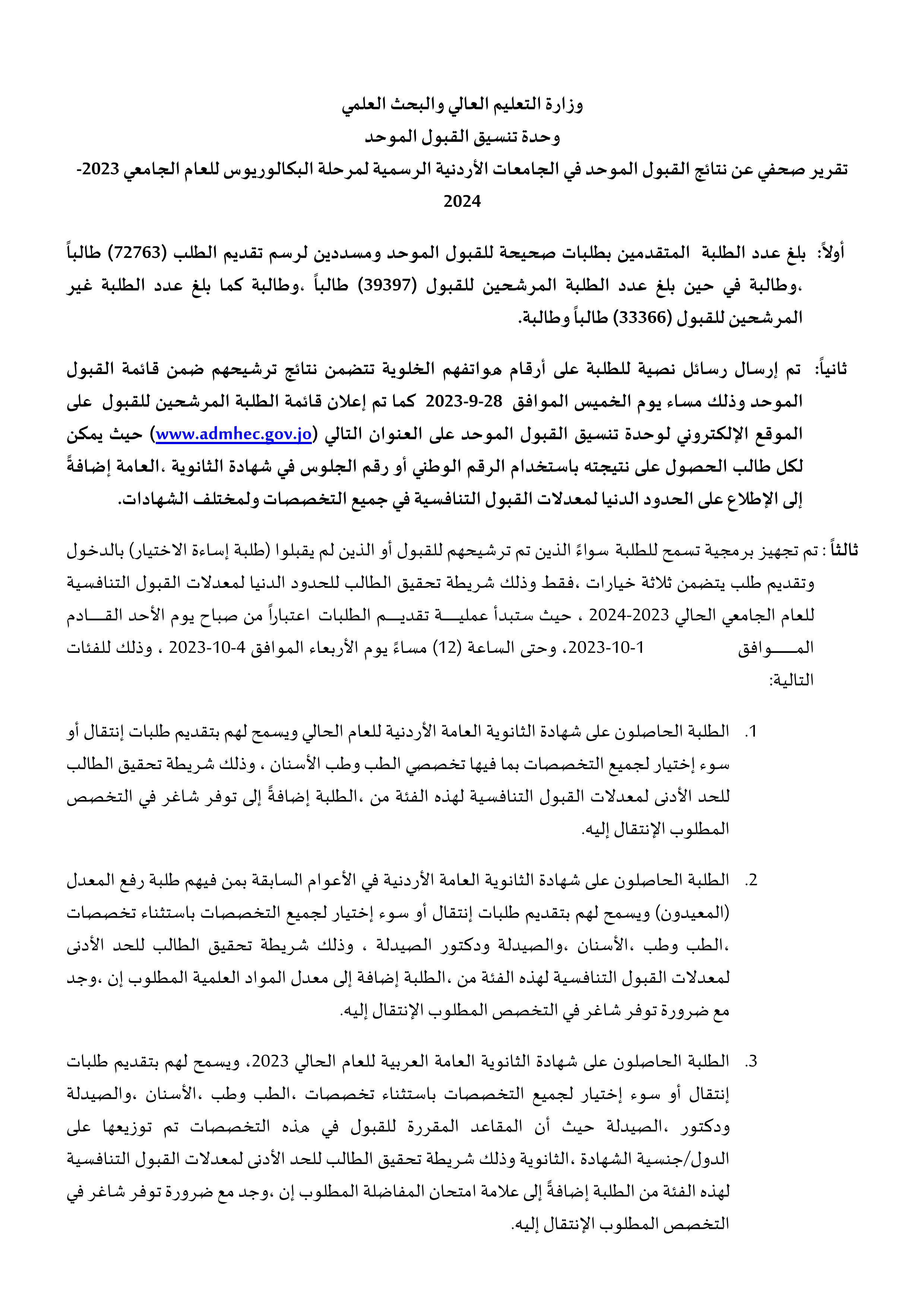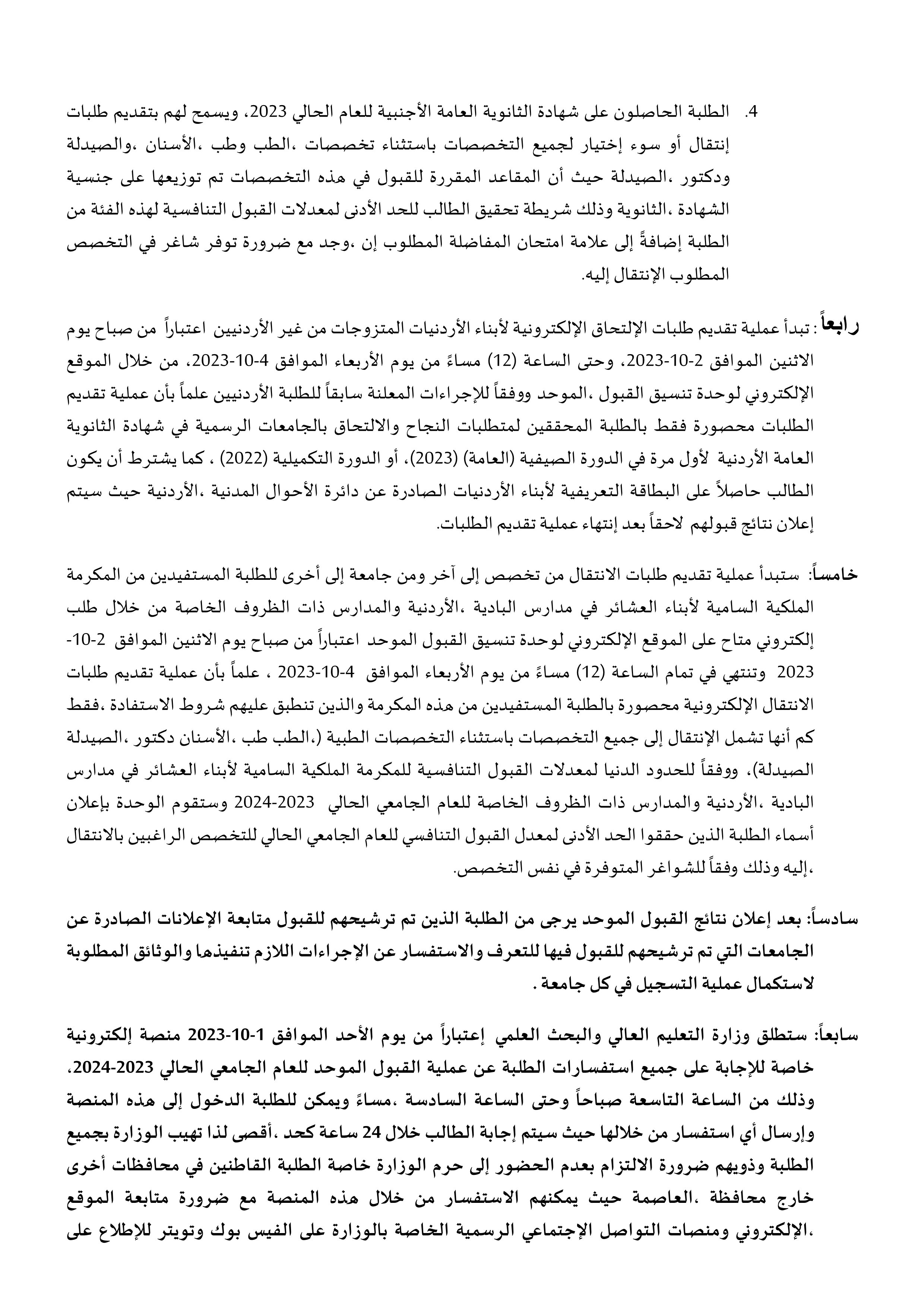 ستطلق وزارة التعليم العالي والبحث العلمي اعتباراً من يوم الأحد الموافق 1-10-2023 منصة إلكترونية خاصة للإجابة على جميع استفسارات الطلبة عن عملية القبول الموحد للعام الجامعي الحالي 2023-2024، وذلك من الساعة التاسعة صباحاً وحتى الساعة السادسة مساءً.