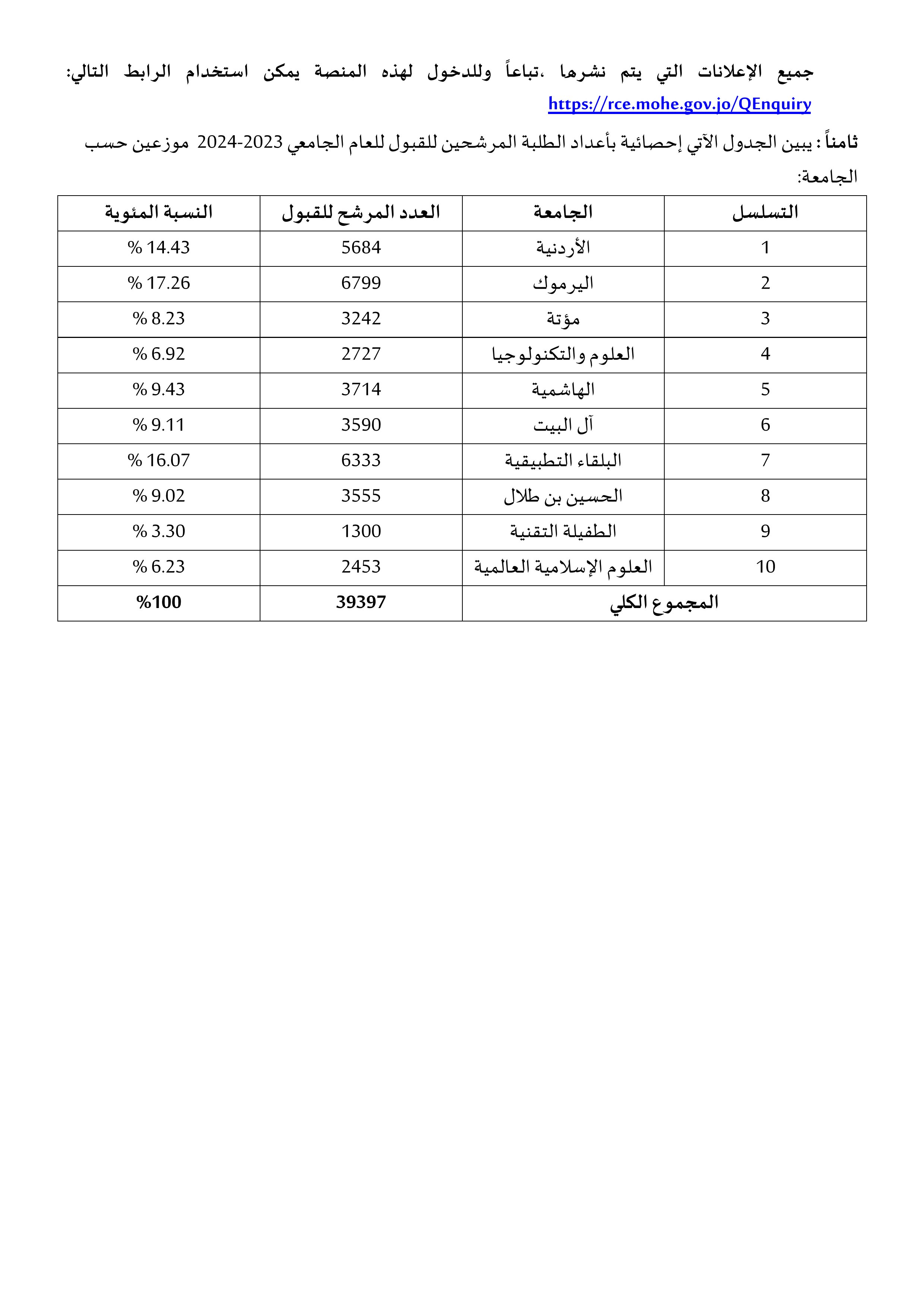 وأهابت الوزارة بجميع الطلبة وذويهم ضرورة الالتزام بعدم الحضور إلى حرم الوزارة خاصة الطلبة القاطنين في محافظات أخرى خارج محافظة العاصمة، حيث يمكنهم الاستفسار من خلال هذه المنصة مع ضرورة متابعة الموقع الإلكتروني، ومنصات التواصل الإجتماعي الرسمية الخاصة بالوزارة على الفيس بوك وتويتر للإطلاع على جميع الإعلانات التي يتم نشرها تباعاً، وللدخول لهذه المنصة يمكن استخدام الرابط التالي: https://rce.mohe.gov.jo/QEnquiry