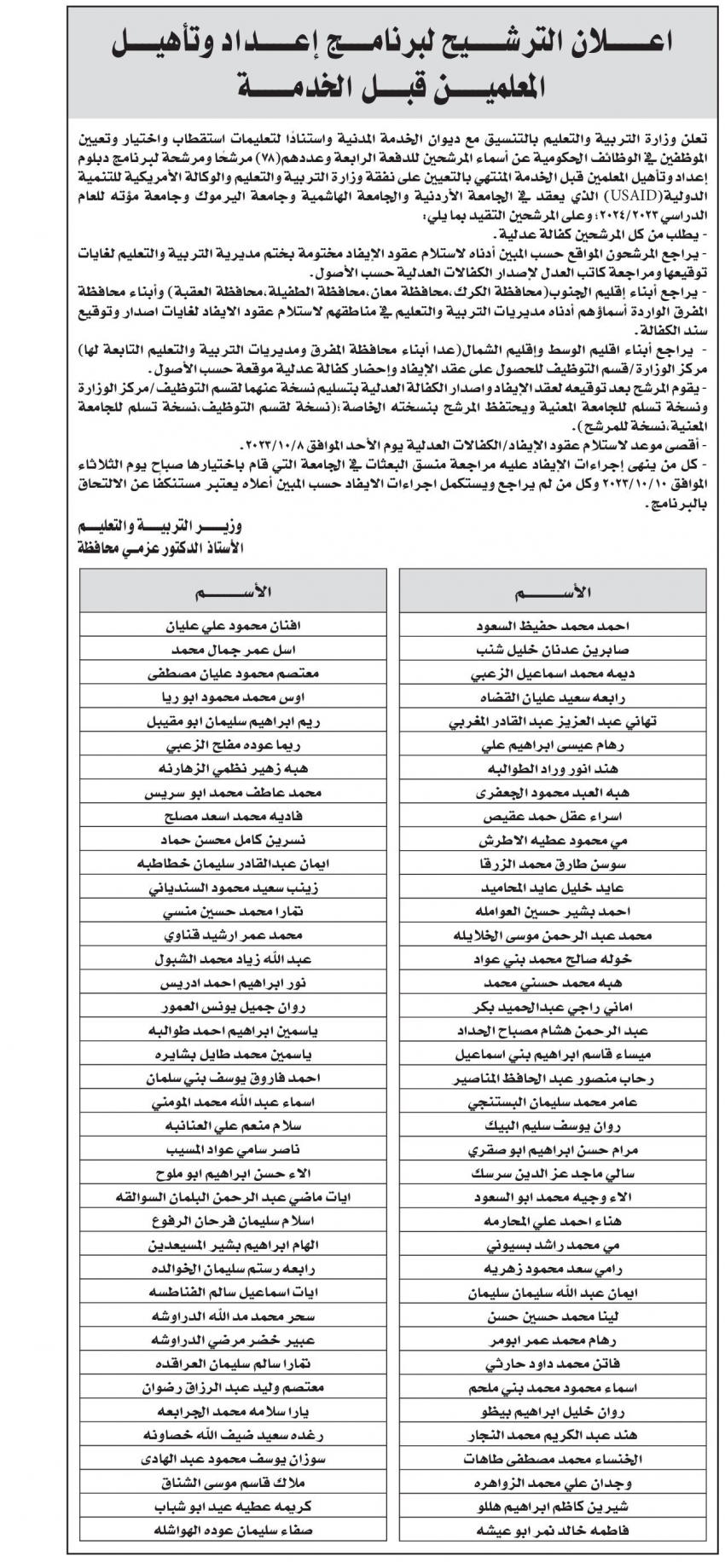 وبحسب الإعلان المنشور عبر الصحف اليومية، فإن الدفعة تتضمن 78 مرشحًا ومرشحة في البرنامج المنتهي بالتعيين على نفقة الوزارة والوكالة الأمريكية للتنمية الدولية.