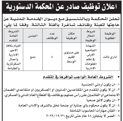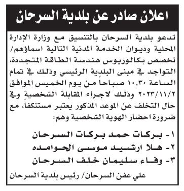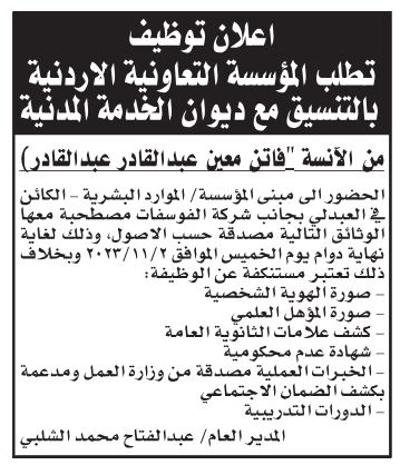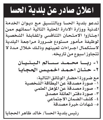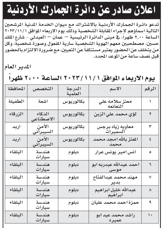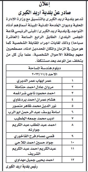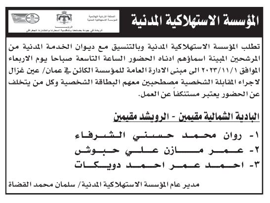 أعلنت عددا من البلديات والمؤسسات الحكومية اليوم الاثنين بالتنسيق مع ديوان الخدمة المدنية، عن حاجتهم لتعبئة وظائف شاغرة، كما دعت عددا من المرشحين لإجراء المقابلات الشخصية.