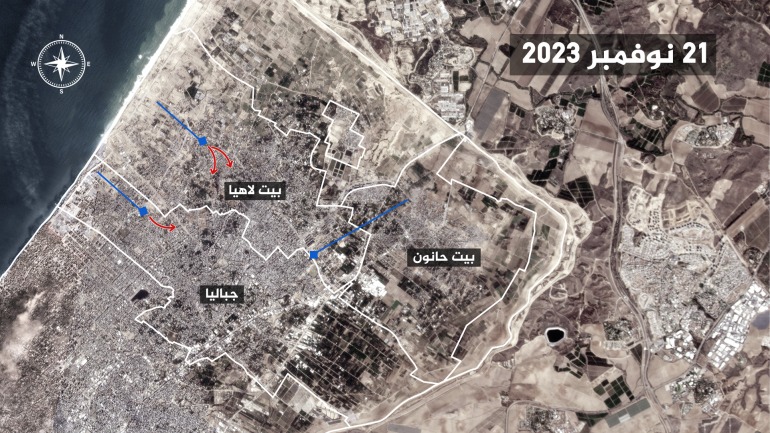 كشف تحليل صور أقمار صناعية حصلت عليها وكالة التحقيق الإخباري بشبكة الجزيرة، عن تباطؤ في معدل تقدم الآليات العسكرية الإسرائيلية في محور شمال غرب بيت لاهيا شمال قطاع غزة، في الفترة بين 17–21 نوفمبر/تشرين الثاني الحالي.