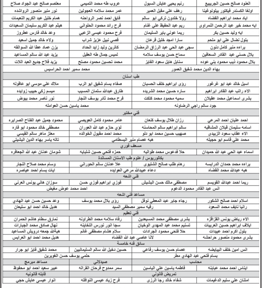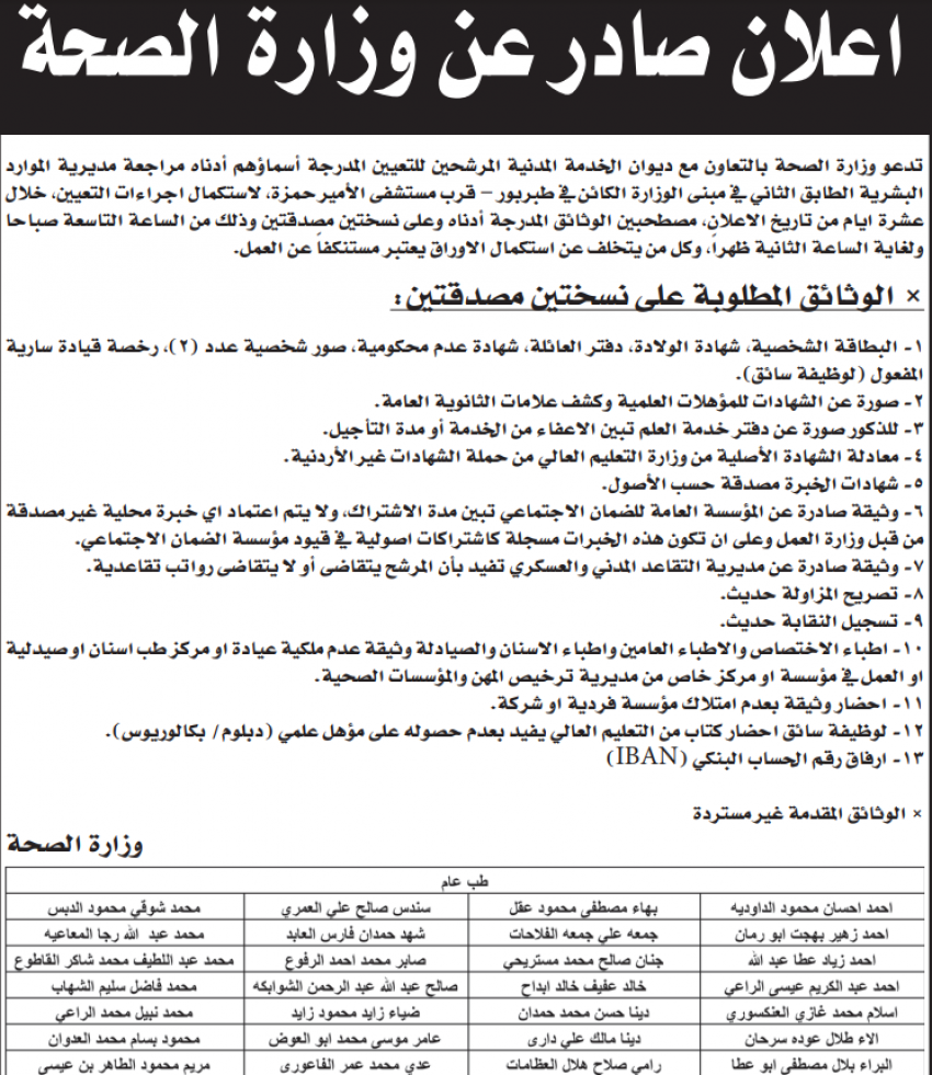 دعت وزارة الصحة بالتعاون مع ديوان الخدمة المدنية المرشحين للتعيين المدرجة اسماؤهم أدناه الى مراجعة مديرية الموارد البشرية في مبنى الوزارة، وذلك لاستكمال اجراءات التعيين .