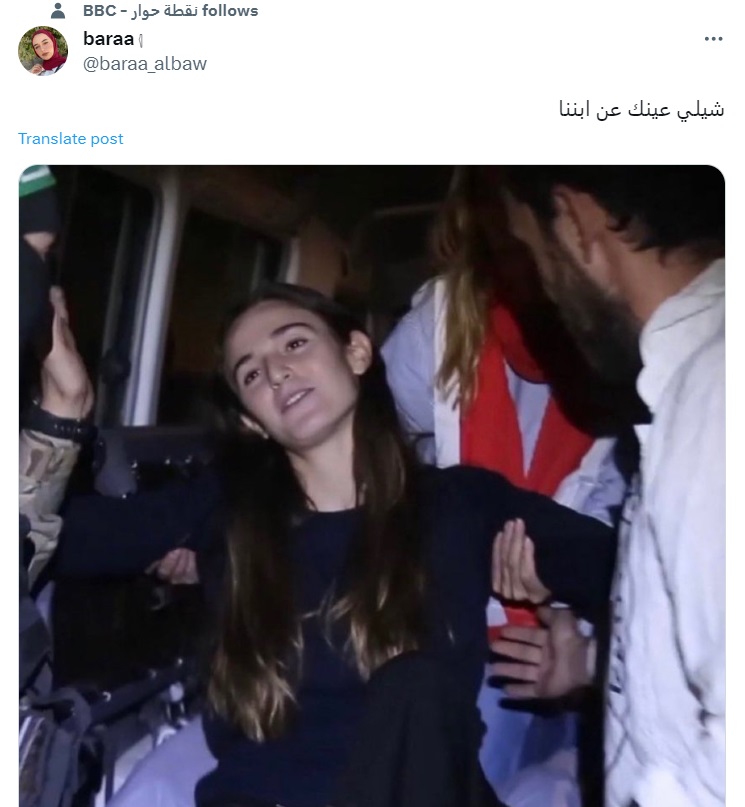 في المقابل، تفاعلت مجموعة من المغردات في الوطن العربي مع المشهد بطريقة "طريفة" بعض الشيء، إذ لم تتمكن إحداهن من إخفاء مشاعر الغيرة على مقاتلي حماس، وبأنهن لن يرتبطن في المستقبل سوى بفتيات عربيات مسلمات، ولن يقعوا في حب أسيرات من إسرائيل.