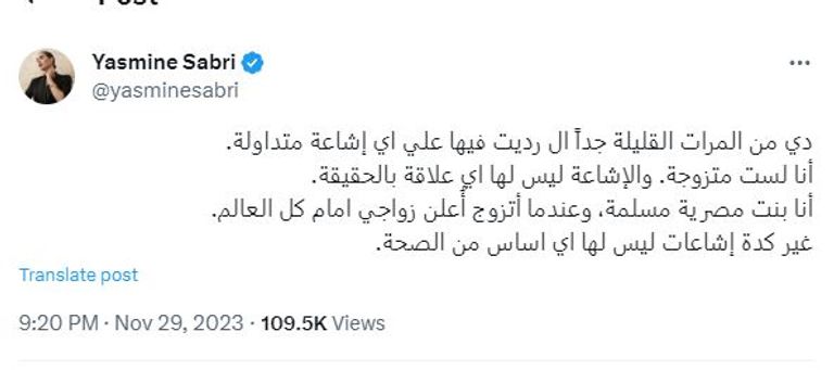 وكتبت ياسمين عبر حسابها على "إكس": "هذه من المرات القليلة جدًا التي أرد فيها على أي شائعة متداولة".