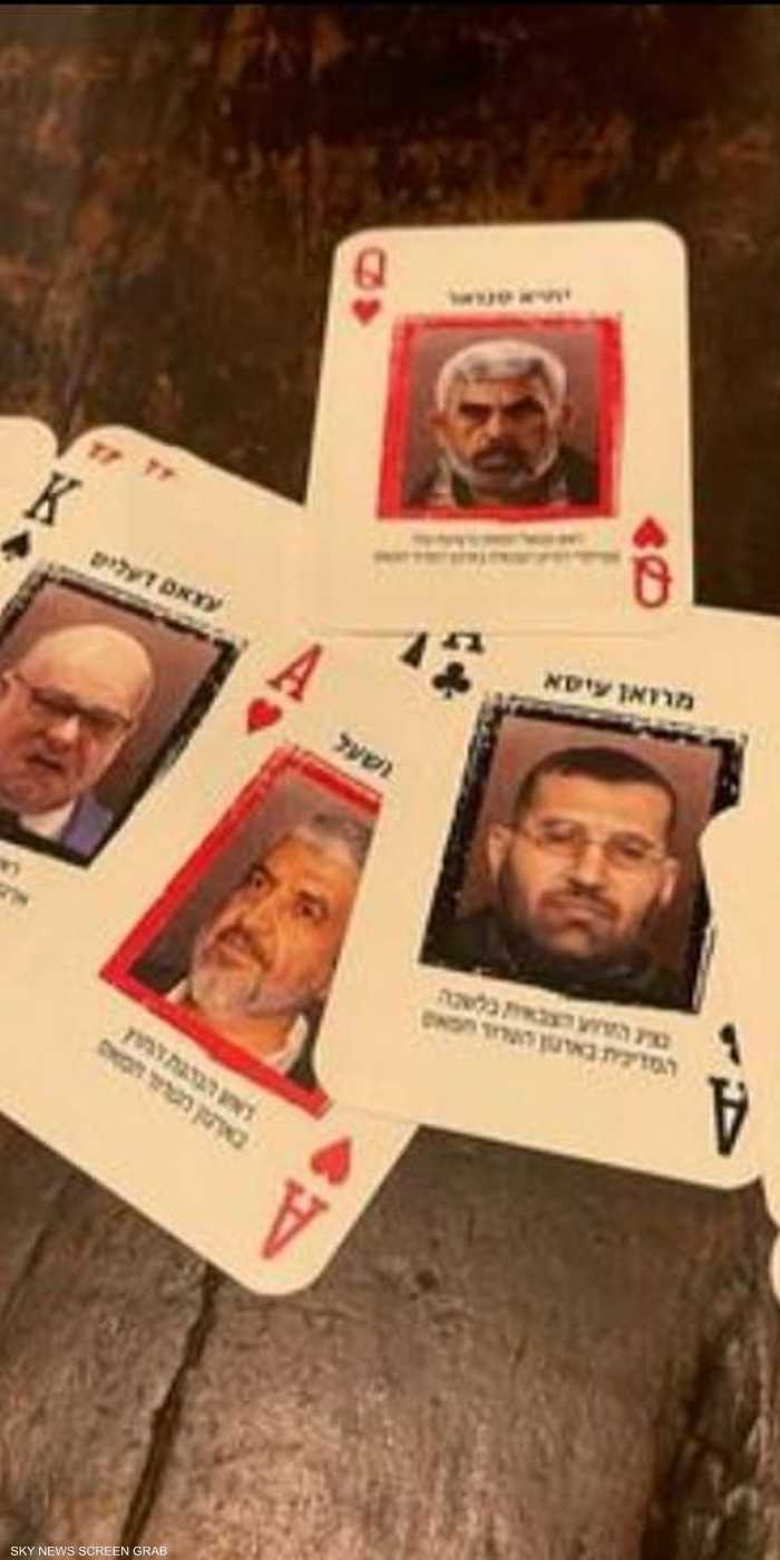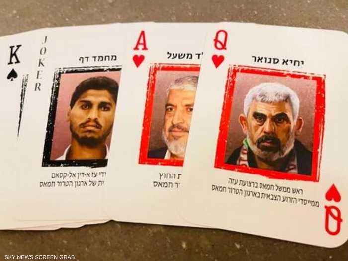وعلى رأس المطلوبين في أوراق اللعب، يوجد قائد حركة حماس يحيى السنوار، بينما على ورقة “الجوكر” المطلوب الأول قائد الجناح العسكري للحركة محمد ضيف.