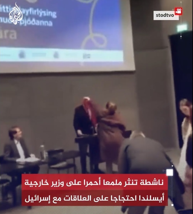 تداول رواد مواقع التواصل ، فيديو نشرته عدة فضائيات عربية ، تظهر قيام ناشطة آيسلندية بنثر مسحوق أحمر على رأس وجسم وزير خارجية بلادها ،تعبيرا عن رفضها للمجازر التي تحدث في غزة .