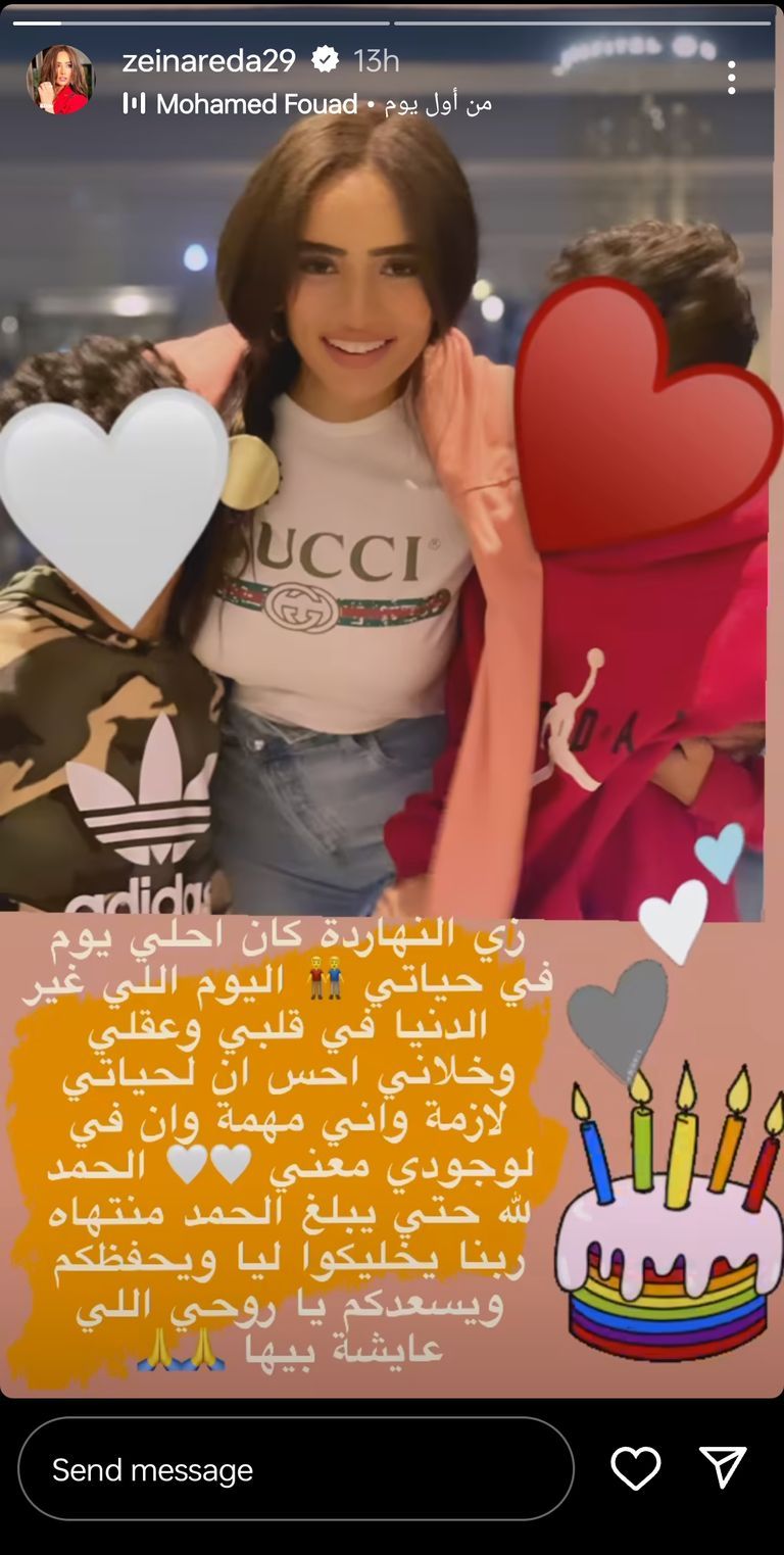 ونشرت زينة عبر خاصية "استوري إنستغرام" صورة مع ابنها خلال التحضير للجبس، وحرصت على إخفاء وجهه.
