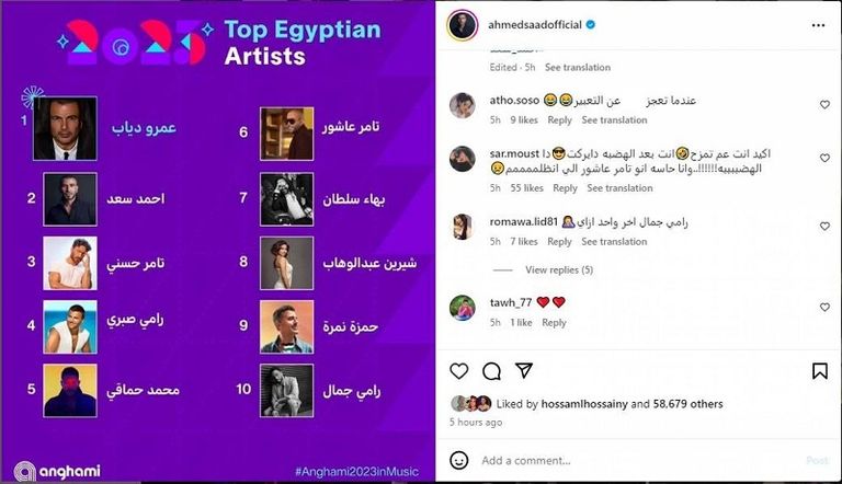 ونشر أحمد سعد عبر حسابه على "إنستغرام" صورة لقائمة ترتيب الأكثر استماعًا على المنصة، بعد نجاح عدد كبير من أغانيه خلال 2023.