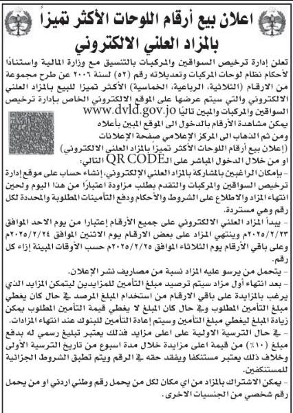اعلنت ادارة الترخيص عن طرح مجموعة من الارقام المميزة (الثلاثية ، الرباعية ، الخماسية) في المزاد العلني الالكتروني اعتبارا من الأحد القادم 23/2/2025.