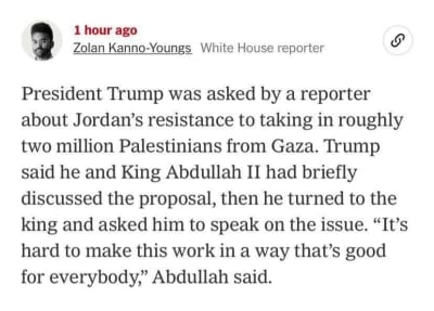 يبدو أن ترجمة ماقاله العاهل الاردني والذي نقله قبل قليل موقع الجزيرة ( ونقلته عنه ) كالآتي : " سوف نري كيف يمكن تحقيق ذلك ( نقل الفلسطينيين ) لمصلحة الجميع " هذه الترجمة لم تكن دقيقة اذ أرسل لي بعض...