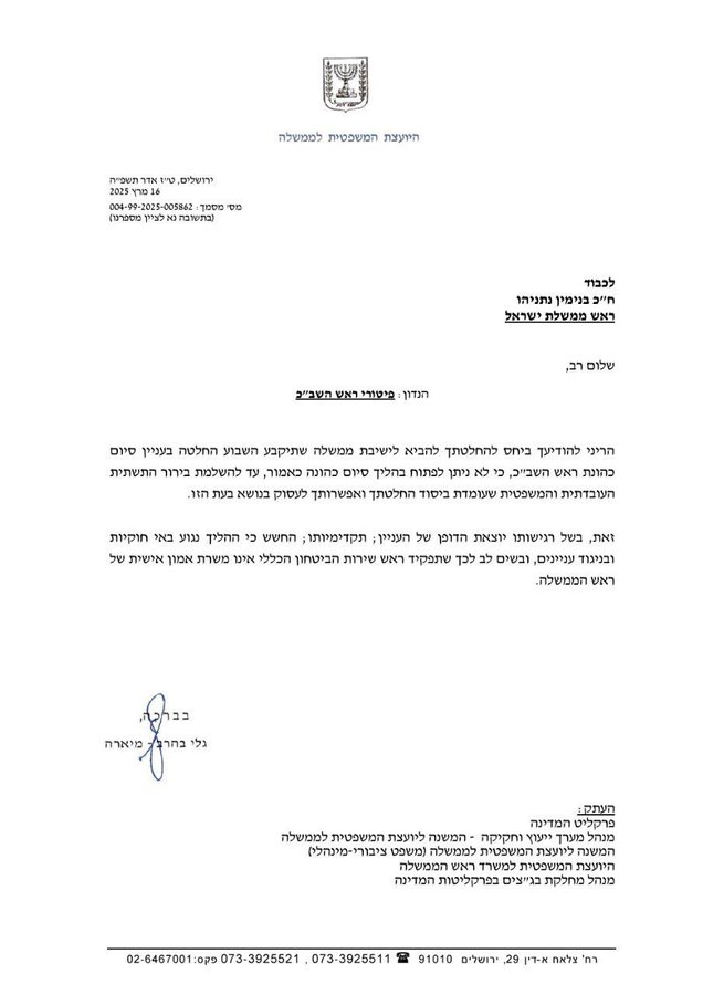 قالت المستشارة القضائية للحكومة الإسرائيلية في رسالة لرئيس الحكومة بنيامين نتنياهو "لا يمكنك إقالة ( رئيس الشاباك ) رونين بار".