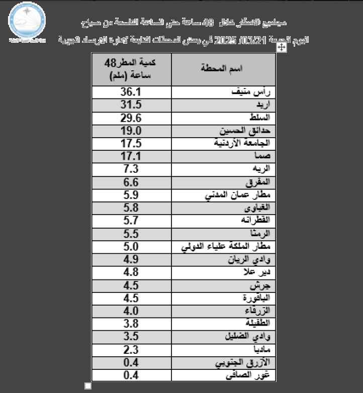 أعلنت إدارة الأرصاد الجوية عن كميات الأمطار التي هطلت في محطاتها المختلفة منذ بداية الحالة الجوية مساء الأربعاء وحتى الساعة التاسعة من صباح اليوم الجمعة. وقد تفاوتت كميات الهطول بين مختلف المناطق، حيث سجلت بعض المحطات كميات مرتفعة، في حين لم تشهد بعض المحافظات، مثل معان والعقبة، أي هطولات.
